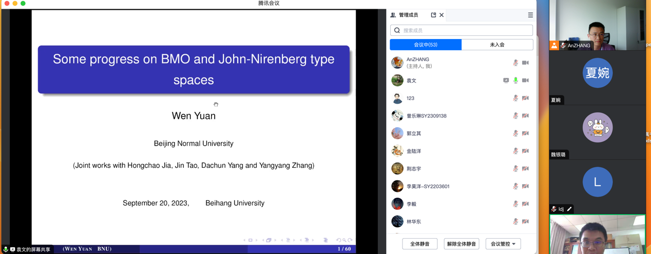 2023年09月20日,北京师范大学袁文教授,应邀为球盟会师生做了题为 “Some progress on BMO and John- Nirenberg type spaces”的学术报告。报告由张安老师主持。
