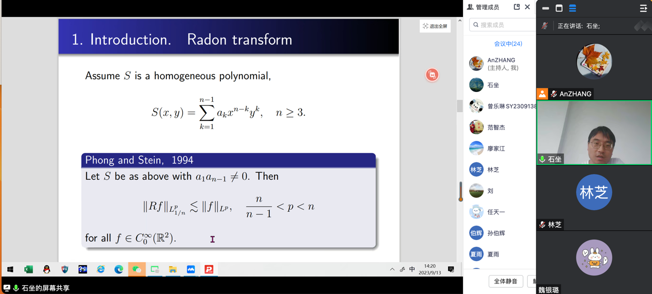 2023年09月13日,中南大学石坐顺华和广州大学范智杰教授,应邀为球盟会师生做了题为 “Failure of endpoint regularity of Radon transforms”和“Recent progress on Schatten classes and Riesz transform commutators”的学术报告。报告由张安老师主持。