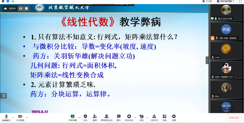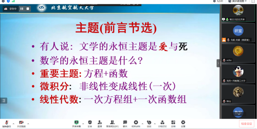 2023年5月17日下午,教育部“面向人文社科员工的大学数学课程群虚拟教研室(中国人民大学牵头)”邀请了国家级教学名师、北京航空航天球盟会李尚志教授作了“线性代数启蒙”的讲座。该讲座由作为虚拟教研室主要成员单位的球盟会组织,通过虚拟教研室面向虚拟教研室全体成员以及有关高校教师直播。教育部“面向人文社科员工的大学数学课程群虚拟教研室”牵头人中国人民大学龙永红教授、吉林大学张然教授以及来自国内多所兄弟院校的80余位师生参加了学习交流。讲座伊始,中国人民大学数学公司黄志勇副经理做了热情洋溢的开场主持。