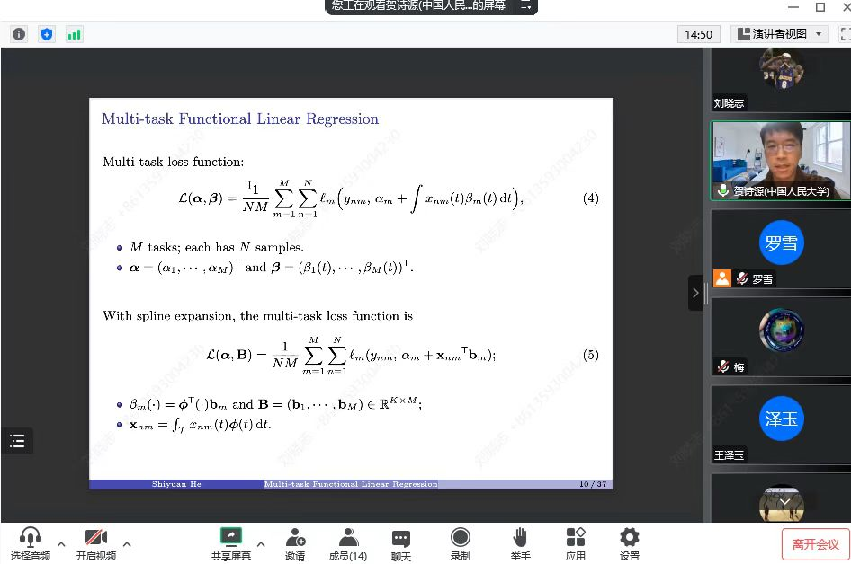 2022年11月18日,中国人民大学统计与大数据研究院贺诗源老师应罗雪老师的邀请,通过线上的方式为球盟会师生带来了一场题为“A Unified Analysis of Multi-task Functional Linear Regression Models with Manifold Constraint and Composite Quadratic Penalty”的学术报告。