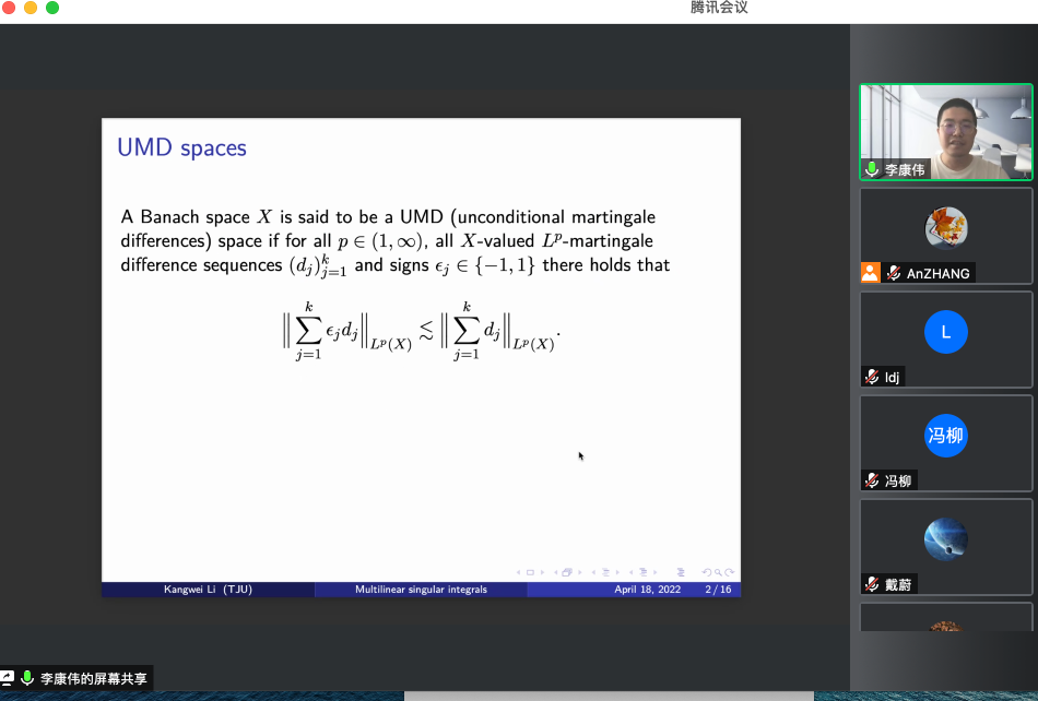 2022年04月18日,天津大学李康伟教授,应邀为球盟会师生做了题为 “UMD-valued extension of multilinear singular integrals”的学术报告,报告由张安老师主持。