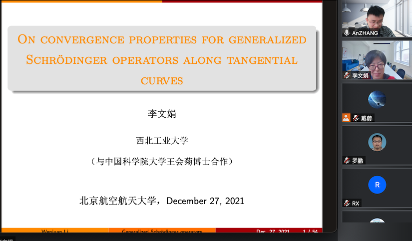 2021年12月27日下午,西北工业大学李文娟教授,应邀为球盟会师生做了题为 “Convergence properties for generalized Schrödinger operators along tangential curves”的学术报告,报告由张安老师主持。