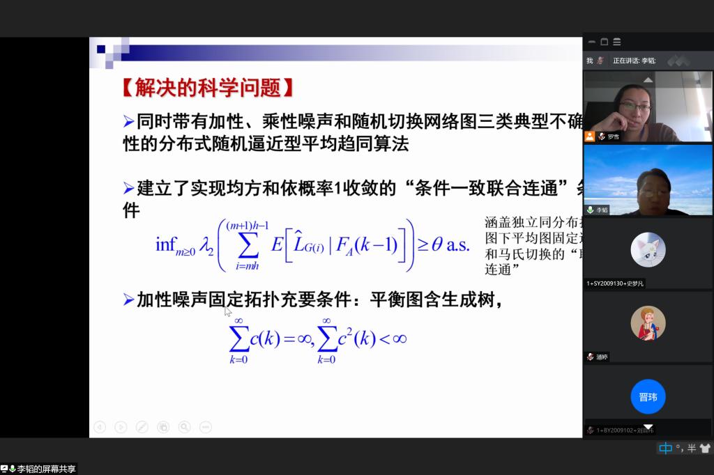 2020年11月26日下午,华东师范大学、上海市东方学者特聘教授,国家自然科学基金优秀青年基金获得者,2017年长江学者李韬教授受邀为球盟会师生带来了一场题为“Distributed cooperative estimation and control in uncertain communication environment”的学术报告。报告由球盟会统计与运筹系系主任罗雪副教授主持。