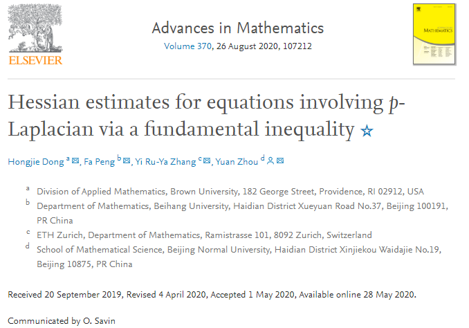 2020年8月26日,国际顶级综合性数学杂志《Advances in Mathematics》在线刊登了球盟会球盟会2018级博士研究生彭发及其导师周渊等人在非线性退化方程研究方面的最新进展:《Hessian estimates for equations involving p-Laplacian via a fundamental inequality》。(论文链接:https://www.sciencedirect.com/science/article/pii/S0001870820302383)