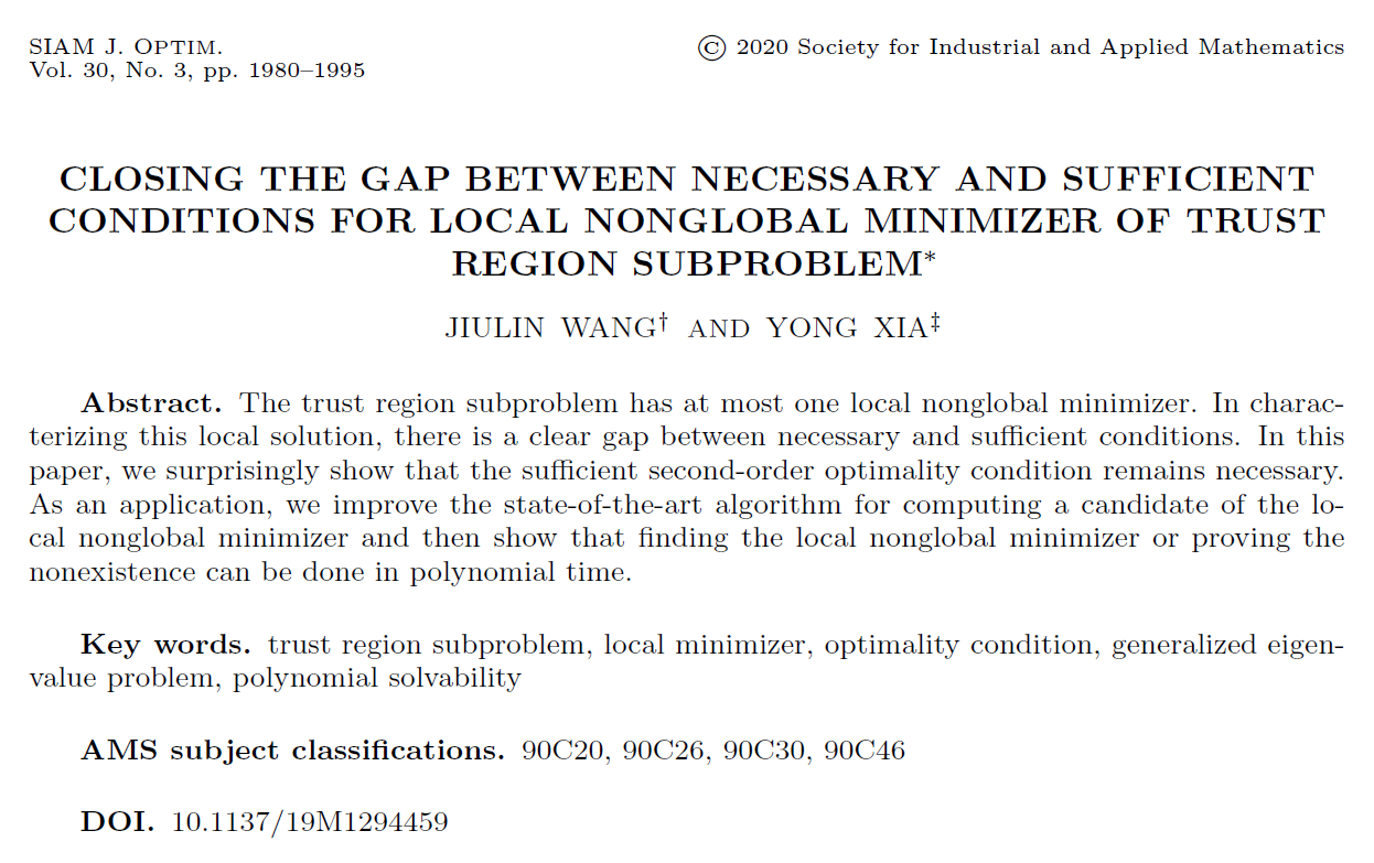 日前,球盟会夏勇教授和2017级博士研究生王玖鳞在著名的信赖域子问题的局部非全局解的最优性条件刻画上取得重要进展,解决了该领域一个困扰27年的数学难题。研究成果“Closing the gap between necessary and sufficient conditions for local non-global minimizer of trust region subproblem”发表在《SIAM Journal on Optimization》,该期刊为数学优化领域权威期刊,2019年影响因子为2.247,期刊副主编认为该项工作是“对非线性规划文献的坚实贡献”(英文原文为“solid contribution to the nonlinear-programming literature”)。(论文链接:https://epubs.siam.org/doi/pdf/10.1137/19M1294459)