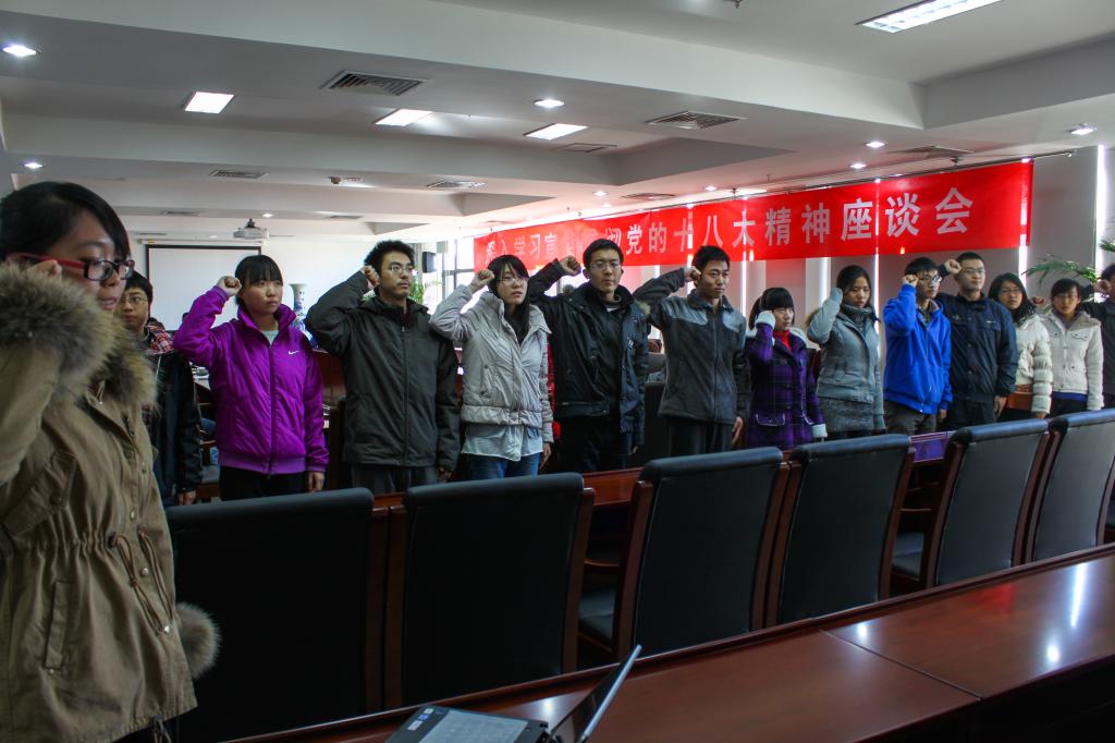 仪式完毕之后,丁丁老师带领支部成员深入学习党的十八大精神以及习近平总书记号召向罗阳员工学习的重要指示,大家观看了相关学习视频材料,并进行了热烈的讨论。最后,丁丁老师做出了支部在月底之前完成赴沙河中心小学服务的共建活动的要求与计划。13时30分许,会议圆满结束。
